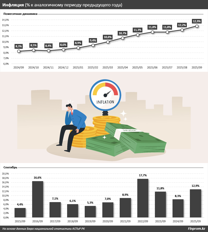 Казахстанцы в последние годы сталкиваются с постоянным ростом цен практически на все товары и услуги. Каждый поход в магазин обходится дороже, счета за коммунальные услуги увеличиваются, а накопленные деньги теряют покупательскую способность. Официальные данные фиксируют двузначную инфляцию: пик пришёлся на 2022 год (годовая инфляция тогда превышала 17%), после чего темпы немного снизились, но в 2025 году вновь приблизились к 13%.